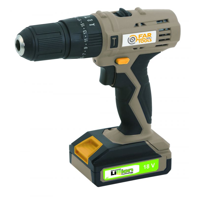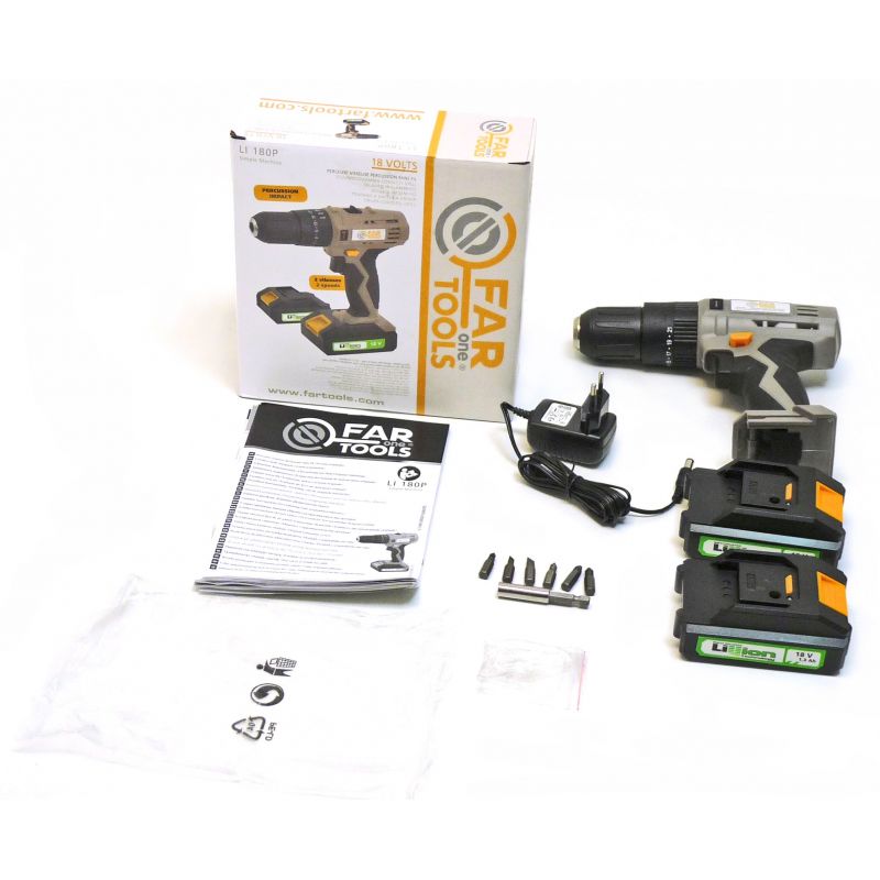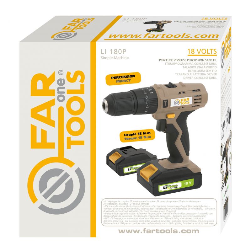 Perceuse à percussion/visseuse sans fil 18V, 2 batteries lithium-ion 1,3Ah - 2 vitesses mécaniques variables 0 à 350tr/min et 0 à 1300tr/min - Percussion 20000cps/min - Mandrin sans clef autoserrant de diamètre 13 mm - Inverseur de sens pour visser et dévisser en toute facilité - Couple maxi 18N.m - 17 niveaux de réglages pour un travail tout en finesse - Poignée confortable et ergonomique soft-grip - LED d'éclairage pour travailler dans les recoins sombres - Chargeur 3h - Pour visser et percer dans le bois, le métal et matériaux à densité moyenne