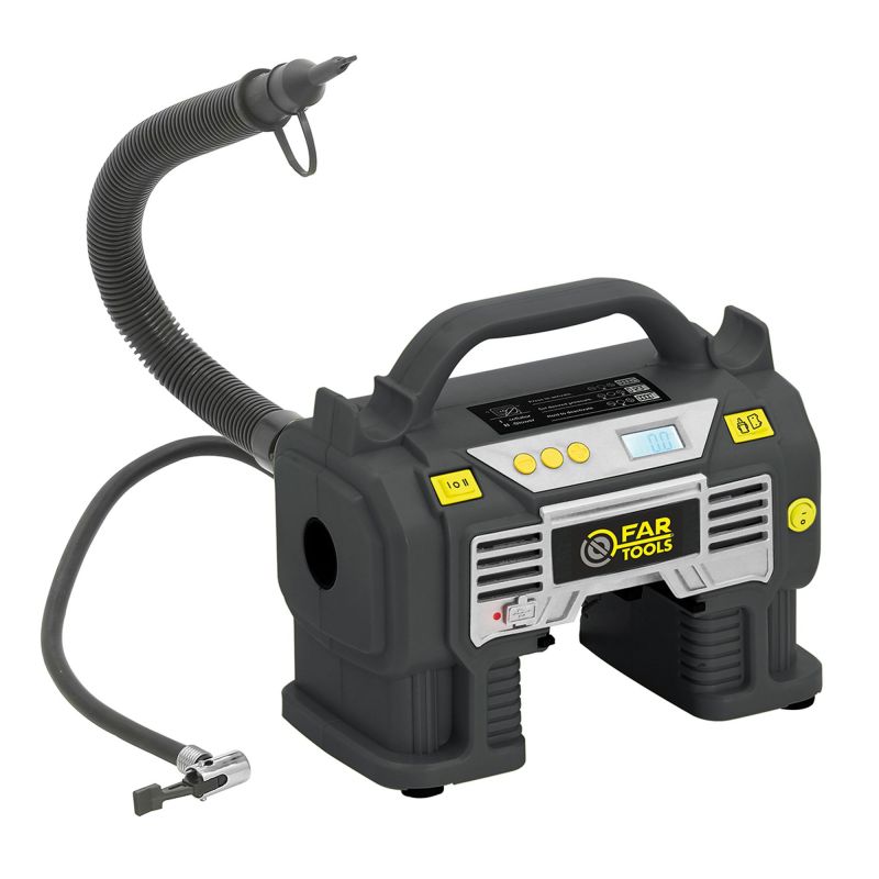 XF-COMP Gonfleur/Compresseur sans fil 18V - Pression réglable jusqu'à 11bar (écran digital d'indication de préssion) - Livré avec multiples buses de gonflage et prise allume cigare - Vendu sans batterie - Pour gonfler jusqu'à une pression de 11 bar - Pratique car il est sans fil, le compresseur à une fonction souffleur avec de multiples buses - Il peut etre alimenté par un chargeur d'allume cigare - Ce produit fait partie de la gamme plateforme FARTOOLS X-FIT 18V permettant d'utiliser la/les même(s) batterie(s) sur l'ensemble des machines de la gamme outillage électroportatif ou outillage jardin.