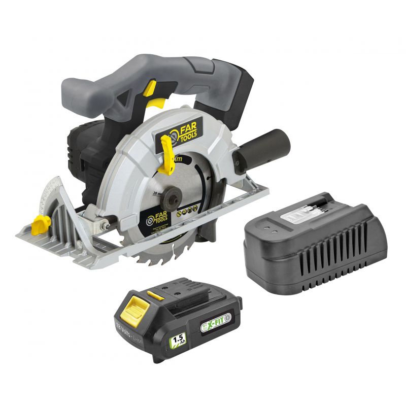 KIT XF-CIRCULAR Scie circulaire sans fil 18V Ø165mm - Lame TCT (pastilles de carbure de tungstène), 24 dents, alésage 20mm - Vitesse de 3800tr/min - Capacité de coupe maxi 50mm à 90° et 30mm à 45° - Base aluminium ultra-rigide et inclinable de 0 à 45° pour réaliser des coupes en biais - Buse collecteur de poussière - Guide parallèle - Double poignée pour une parfaite ergonomie et confort soft-grip - Carters de protection métal pour une totale sécurité - Pour scier des planches de bois, en coupe droite. Faible niveau de transmission des vibrations - Vendue avec batterie 1,5Ah et chargeur rapide (30min) - Ce produit fait partie de la gamme plateforme FARTOOLS X-FIT 18V permettant d'utiliser la/les même(s) batterie(s) sur l'ensemble des machines de la gamme outillage électroportatif ou outillage jardin.