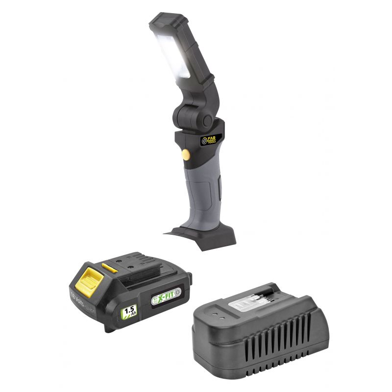 KIT XF-LIGHT Lumière de travail sans fil 18V 3W/100Lm - Tête orientable à 180° et inclinable jusqu'à 7 positions avec crochet d'attache - Poignée principale confortable et ergonomique soft-grip - Vendue avec batterie 1,5Ah et chargeur rapide (30min) - Ce produit fait partie de la gamme plateforme FARTOOLS X-FIT 18V permettant d'utiliser la/les même(s) batterie(s) sur l'ensemble des machines de la gamme outillage électroportatif ou outillage jardin.