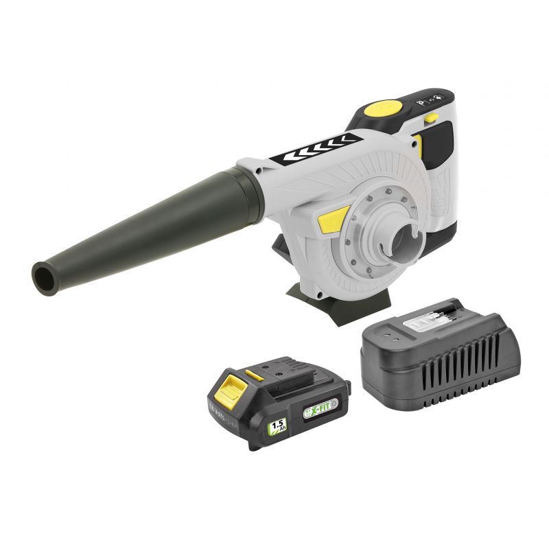 KIT XF-BLOWER Souffleur/Aspirateur sans fil 18V pour atelier ou pour jardin - Succion 4,5Kpa - Soufflerie 6,3m3/s - oignée rotative - Facilement transportable car à sa poignée principale confortable et ergonomique soft-grip - Eclairage LED - Vendu avec batterie 1,5Ah et chargeur rapide (30min) - Pour aspirer et souffler les chantiers ou en extérieur -Pratique car sans fil et léger, les 2 fonctions souffleur et aspirateur en font un produit très pratique - Ce produit fait partie de la gamme plateforme FARTOOLS X-FIT 18V permettant d'utiliser la/les même(s) batterie(s) sur l'ensemble des machines de la gamme outillage électroportatif ou outillage jardin.