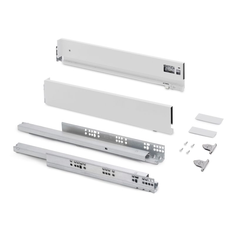 Kit pour tiroir de cuisine et salle de bain Vertex avec tous les éléments nécessaires à son montage. C'est la solution optimale pour vos meubles de cuisine, de salle de bain ou d'armoire avec un design élégant en blanc. Chaque kit est composé de tous les éléments nécessaires au montage d'un tiroir extérieur de hauteur 93mm, dimensionnées pour une épaisseur de panneau de 16mm pour le fond et l'arrière du tiroir. Comprend: deux côtés latérales, un ensemble de guides à fermeture amortie, un ensemble de couvre-garnitures et des attaches avant de tiroir.