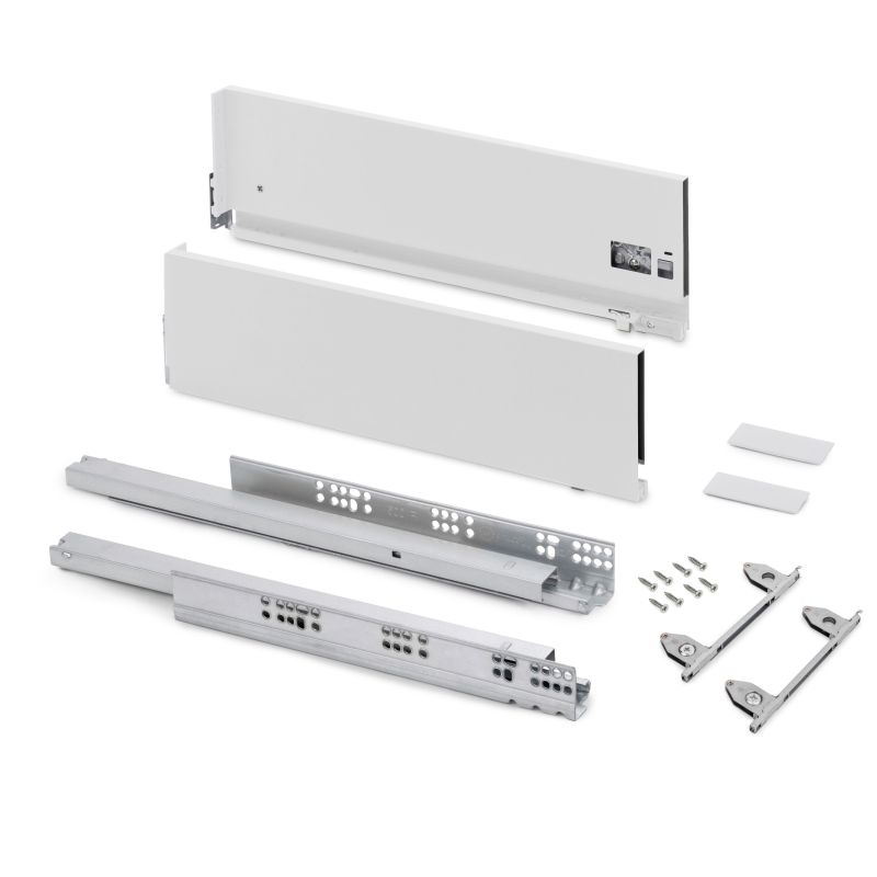 Kit pour tiroir de cuisine et salle de bain Vertex avec tous les éléments nécessaires à son montage. C'est la solution optimale pour vos meubles de cuisine, de salle de bain ou d'armoire avec un design élégant en blanc. Chaque kit est composé de tous les éléments nécessaires au montage d'un tiroir extérieur de hauteur 178mm, dimensionnées pour une épaisseur de panneau de 16mm pour le fond et l'arrière du tiroir. Comprend: deux côtés latérales, un ensemble de guides à fermeture amortie, un ensemble de couvre-garnitures et des attaches avant de tiroir.