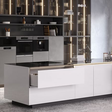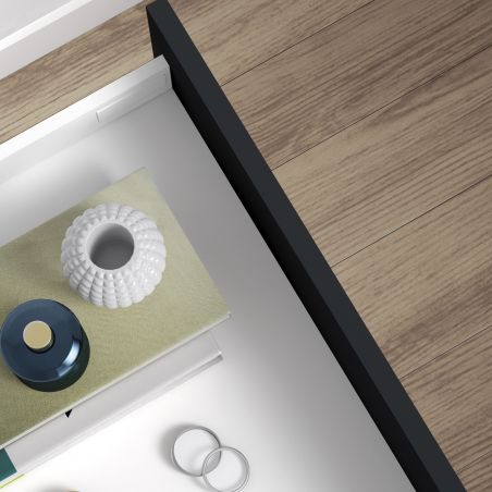 Les côtés latérales métalliques sont en acier avec finition peinte en blanc, permettent de régler la façade du tiroir ± 2mm verticalement et ± 1mm horizontalement. Les guides sont à sortie totale avec fermeture amortie et permettent une charge maximale de 40Kg pour le tiroir.