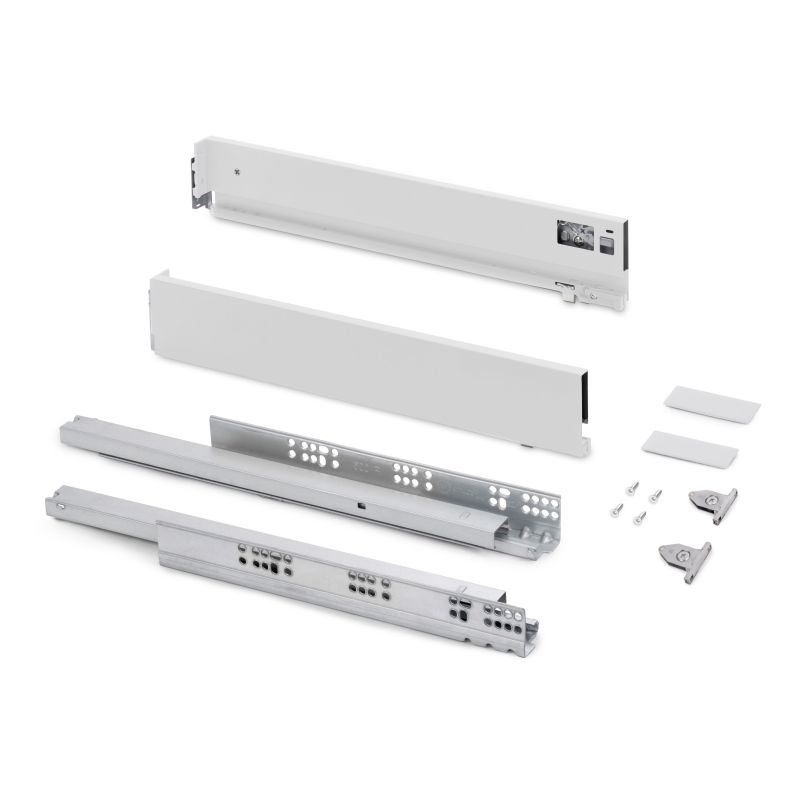 Kit pour tiroir de cuisine et salle de bain Vertex avec tous les éléments nécessaires à son montage. C'est la solution optimale pour vos meubles de cuisine, de salle de bain ou d'armoire avec un design élégant en blanc. Chaque kit est composé de tous les éléments nécessaires au montage d'un tiroir extérieur de hauteur 83mm, dimensionnées pour une épaisseur de panneau de 16mm pour le fond et l'arrière du tiroir.. Comprend: deux côtés latérales, un ensemble de guides à fermeture amortie, un ensemble de couvre-garnitures et des attaches avant de tiroir.