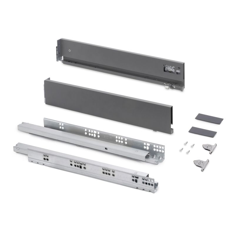 Kit pour tiroir de cuisine et salle de bain Vertex avec tous les éléments nécessaires à son montage. C'est la solution optimale pour vos meubles de cuisine, de salle de bain ou d'armoire avec un design élégant, disponible en aluminium, gris anthracite ou blanc. Chaque kit est composé de tous les éléments nécessaires au montage d'un tiroir extérieur de hauteur 93 mm, dimensionnées pour une épaisseur de panneau de 16mm pour le fond et l'arrière du tiroir. Comprend : deux côtés latérales, des coulisses à fermeture amortie, un ensemble de couvre-garnitures et des attaches avant de tiroir.