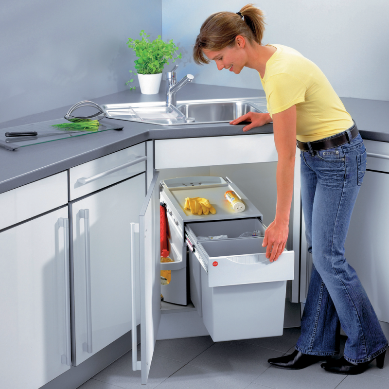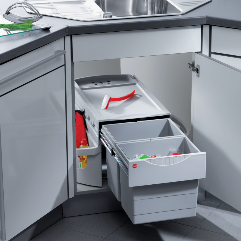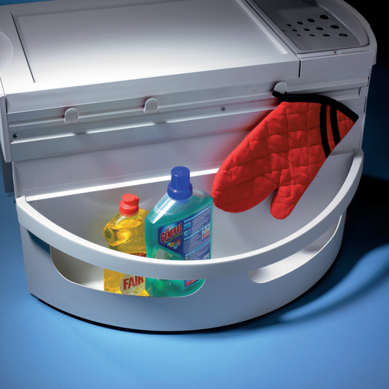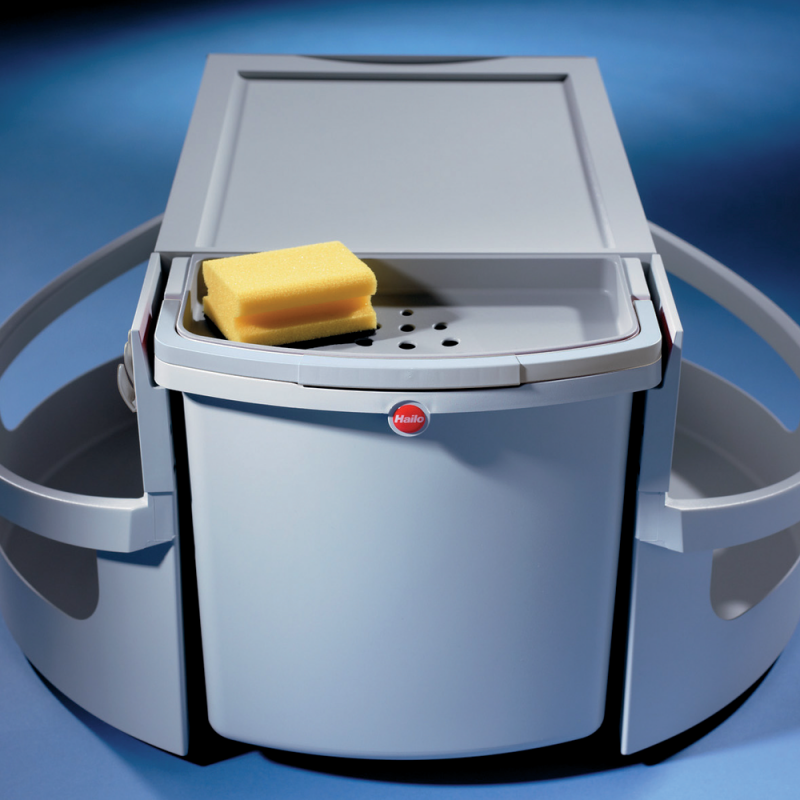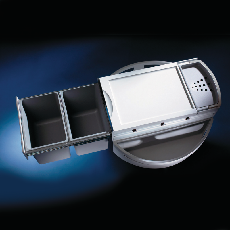 La poubelle Rondo est unique en la matière car elle est l'une des rares poubelles coulissantes à pouvoir d'installer dans un meuble d'angle. Elle se compose de 2 bacs de 18 litres accessibles par simple tirage manuel de la poubelle et de 2 bacs de rangement supplémentaires de chaque côté de la poubelle et accessible en pivotant la poubelle sur la gauche et la droite. Pivoter ? Oui ! La poubelle pivote sur elle-même et vous offrira un 4ème bac avec couvercle à l'arrière de cet ensemble.