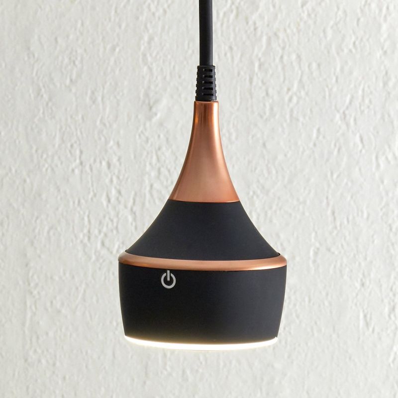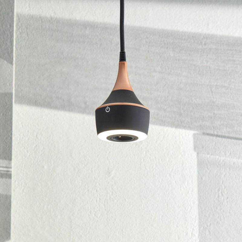 L'éclairage se contrôle grâce à un interrupteur tactile avec variateur d'intensité. La fonction ON/OFF s'active par un toucher court et le variateur d'intensité par des touchers longs. Le câble d'alimentation est de couleur noir mat avec effet textile déco tressé, ajustable sur une longueur totale de 1500mm.