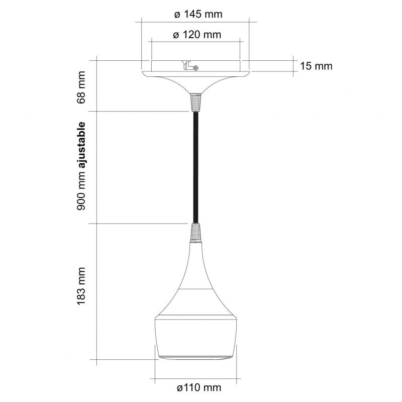 Parmi ses caractéristiques techniques, la suspension MERCURY présente un flux lumineux de 210 lumens et un angle d’éclairage de 120°, garantissant une diffusion uniforme de la lumière. Elle est équipée d’un câble noir mat en caoutchouc de 1,70 mètre, offrant une flexibilité lors de l’installation. La fixation se fait par vis au plafond, assurant une stabilité optimale. Avec un poids de 1,2 kg et des dimensions compactes, elle s’intègre facilement dans divers environnements.