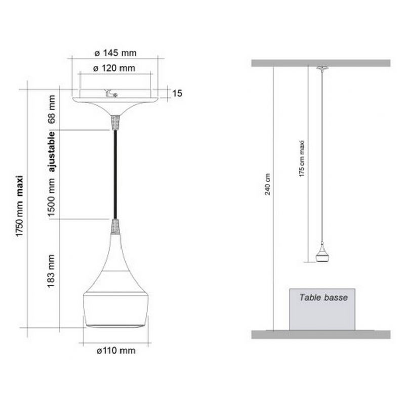 Parmi ses caractéristiques techniques, la suspension MERCURY présente un flux lumineux de 210 lumens et un angle d’éclairage de 120°, garantissant une diffusion uniforme de la lumière. Elle est équipée d’un câble noir mat en caoutchouc de 1,70 mètre, offrant une flexibilité lors de l’installation. La fixation se fait par vis au plafond, assurant une stabilité optimale. Avec un poids de 1,2 kg et des dimensions compactes, elle s’intègre facilement dans divers environnements.