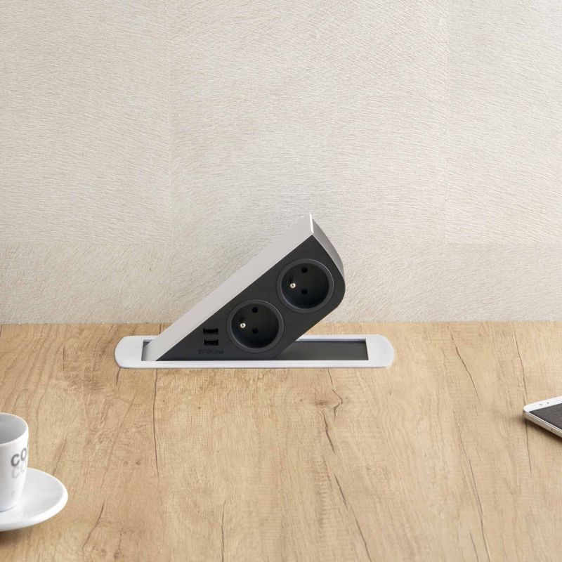 Bloc 2 prises + 2 USB CIZO affleurant à encastrer dans le plan de travail, Blanc mat (RAL 9010)