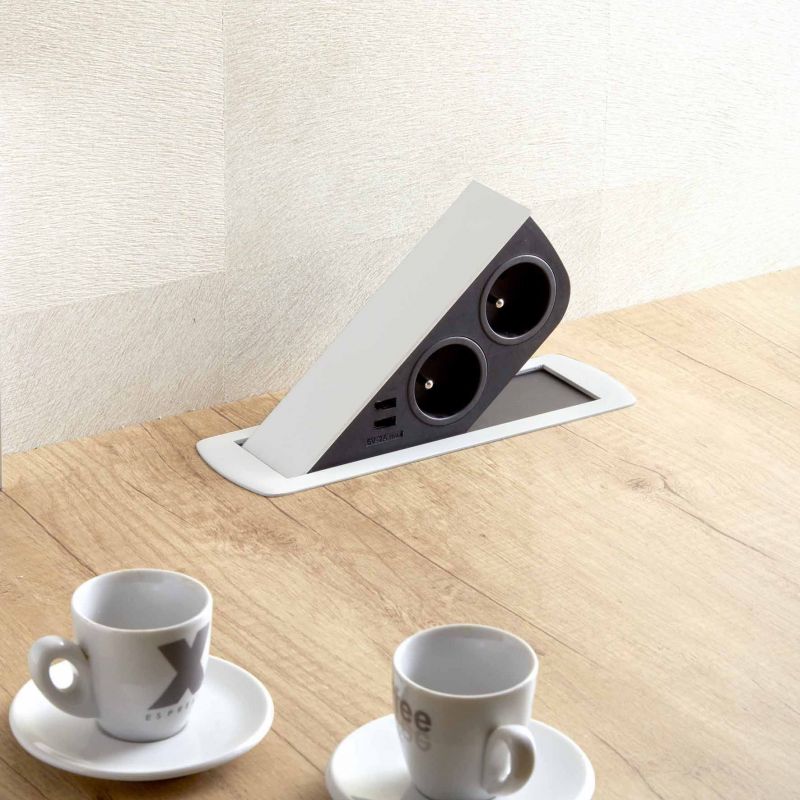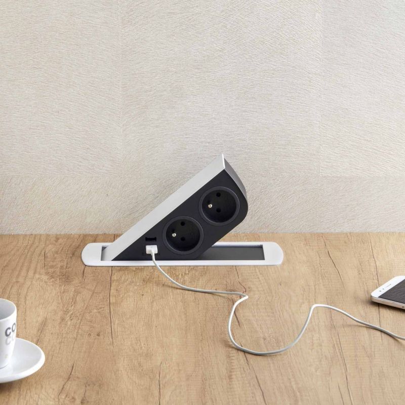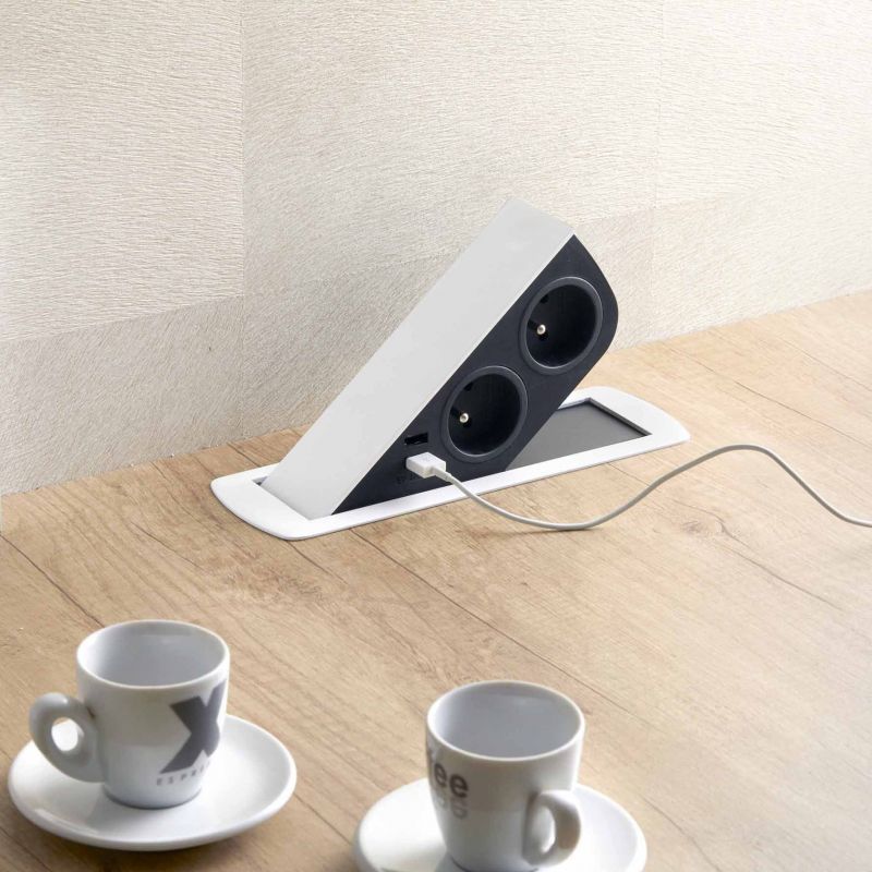 Ce bloc prise encastrable allie esthétisme et fonctionnalité. Il reste totalement invisible une fois fermé, puis s’ouvre d’une simple pression grâce à un mécanisme à clapet en métal, dévoilant deux prises 16A et deux ports USB. Ce système discret permet de garder une surface parfaitement nette tout en disposant de prises accessibles à tout moment, pour alimenter vos appareils électroménagers ou recharger vos périphériques numériques. Ingénieux, une plaque remonte lors de l'ouverture afin d'obstruer la partie vide lorsque le bloc prise est en position 40°.