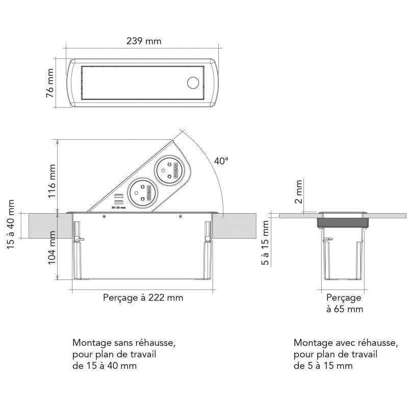 Il est livré avec une réhausse servant également de gabarit pour une découpe précise de 222 x 65 mm. Cette réhausse convient aux plans de 5 à 15 mm d’épaisseur, mais peut être retirée pour une installation sur des surfaces plus épaisses. Le bloc prise se fixe facilement et solidement à votre plan de travail par un simple vissage.