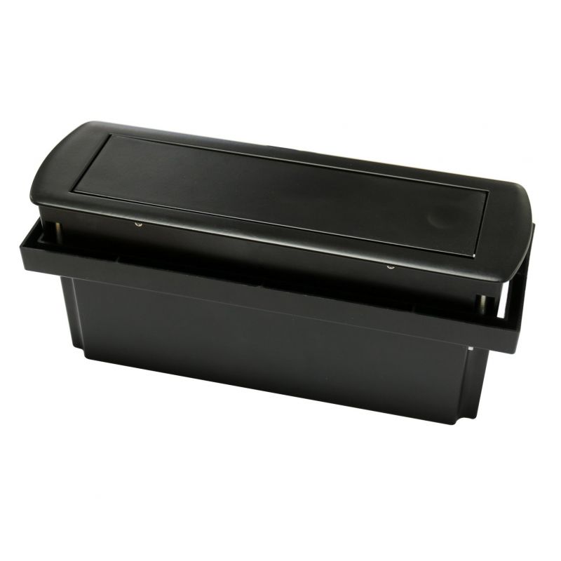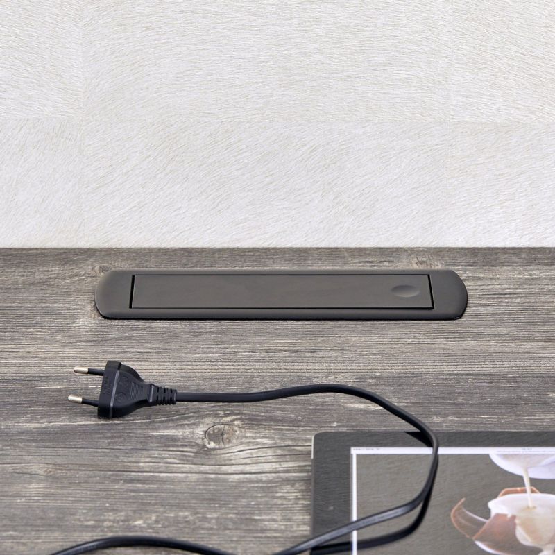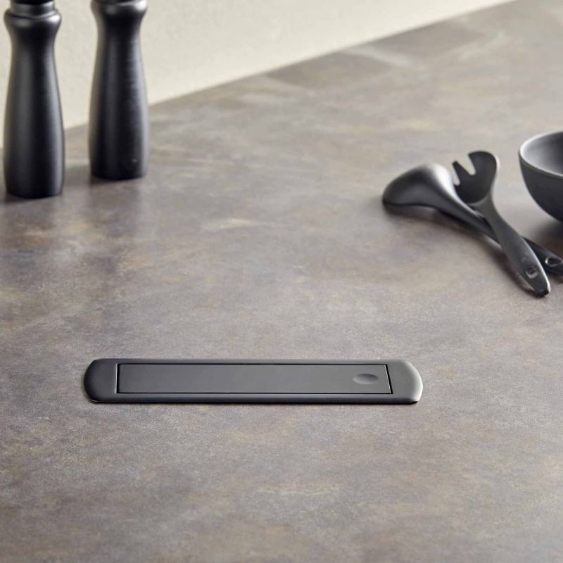 Le bloc prise CIZO est conçu pour être encastré proprement dans le plan de travail. Il est livré avec une réhausse servant également de gabarit pour une découpe précise de 222 x 65 mm. Cette réhausse convient aux plans de 5 à 15 mm d’épaisseur, mais peut être retirée pour une installation sur des surfaces plus épaisses. Le bloc prise se fixe facilement et solidement à votre plan de travail par un simple vissage. Sa finition noir mat RAL 9005 apporte une touche d’élégance intemporelle à tout aménagement intérieur.