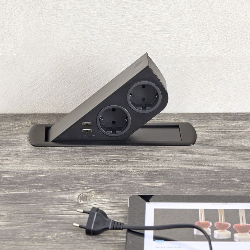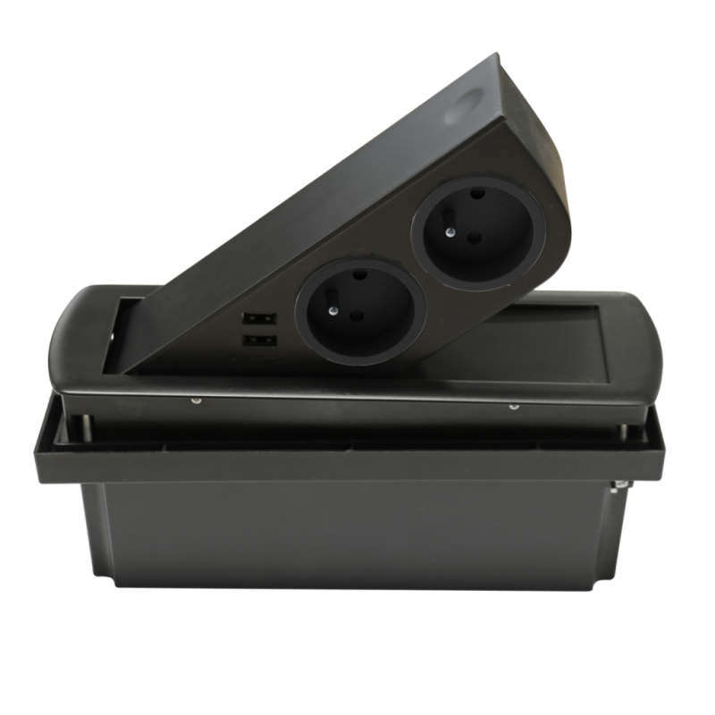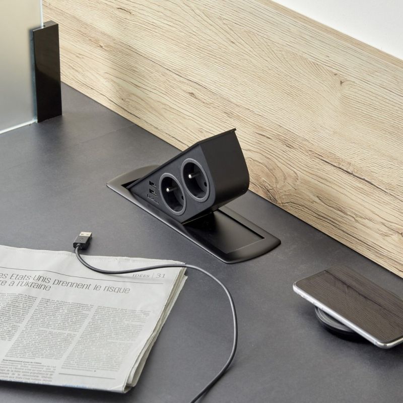 Bloc 2 prises + 2 USB CIZO affleurant à encastrer dans le plan de travail, Noir mat (RAL 9005)