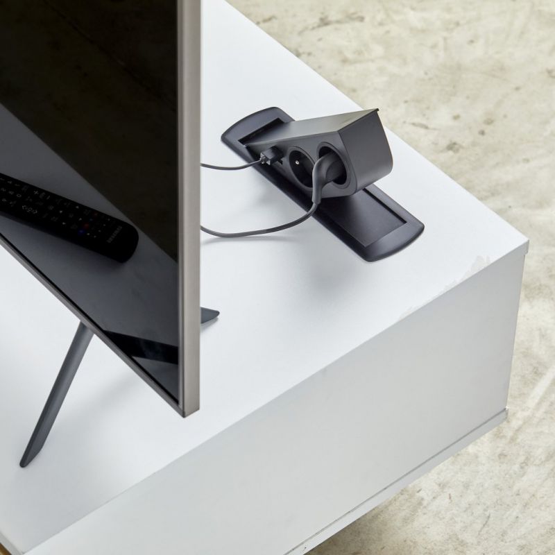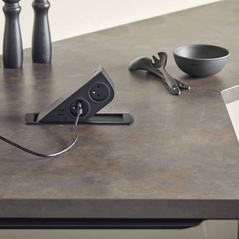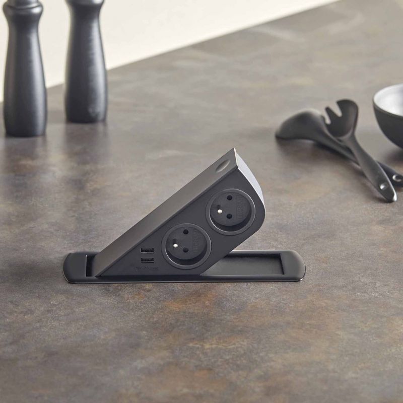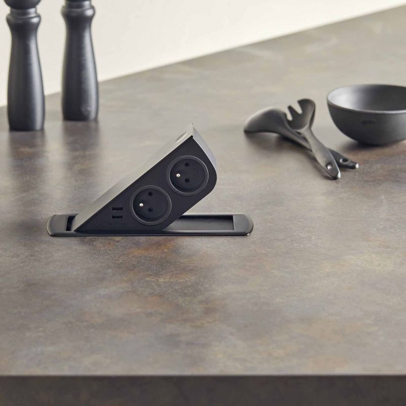 Ce bloc prise encastrable allie esthétisme et fonctionnalité. Il reste totalement invisible une fois fermé, puis s’ouvre d’une simple pression grâce à un mécanisme à clapet en métal, dévoilant deux prises 16A et deux ports USB. Ce système discret permet de garder une surface parfaitement nette tout en disposant de prises accessibles à tout moment, pour alimenter vos appareils électroménagers ou recharger vos périphériques numériques. Ingénieux, une plaque remonte lors de l'ouverture afin d'obstruer la partie vide lorsque le bloc prise est en position 40°.
