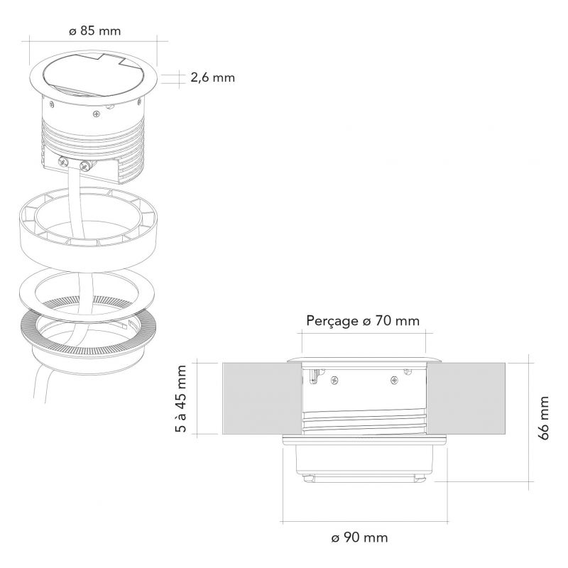 Facile et rapide à installer, ce bloc prise encastrable se fixe sur votre plan de travail après avoir réalisé au préalable un perçage de 70mm de diamètre. Il s’adapte à des plans de travail d’une épaisseur allant de 5 à 45 mm. Il est équipé d’un câble d'alimentation de 1 mètre (3 x 1,5 mm²) avec fiche euro, prêt à l’installation. Son clapet en métal protège efficacement les prises de la poussière et de l’humidité, tout en assurant une ouverture simple et fluide grâce à son système d'assistance à l'ouverture et à la fermeture. Design, fonctionnel et robuste, ce bloc prise finition chrome noir est un choix stratégique pour optimiser votre espace avec style.