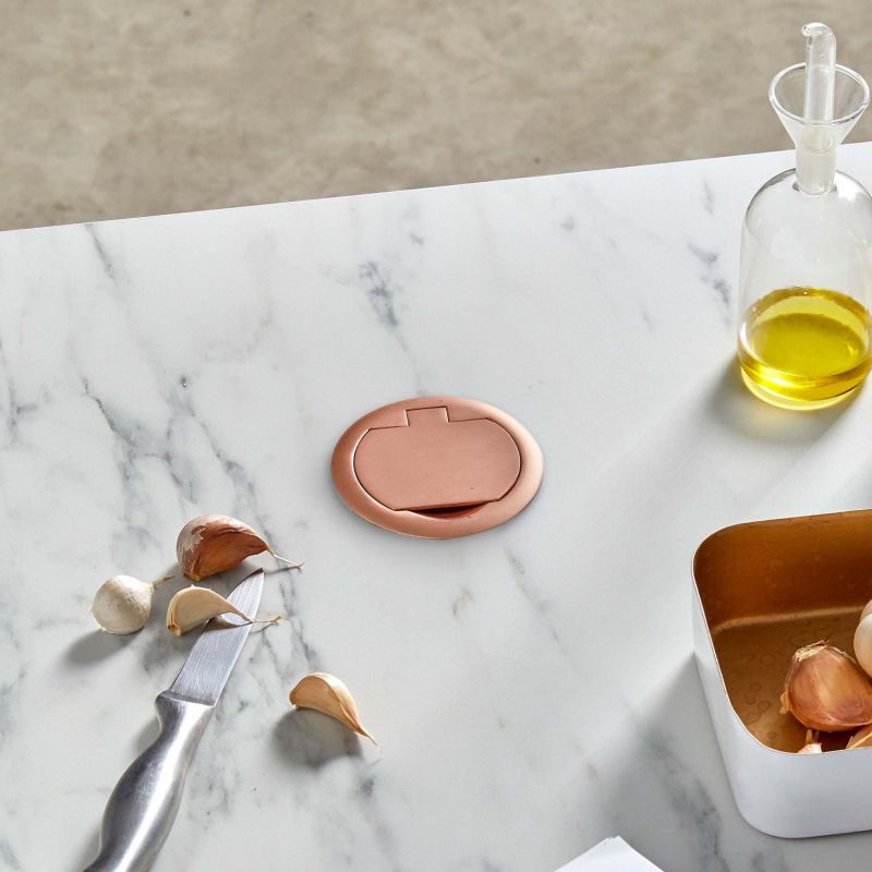 Pensé pour une installation rapide et facile, le bloc prise RING s’encastre dans votre plan de travail après avoir préalablement réalisé un perçage de 70 mm de diamètre. Il convient aux plans de travail de 5 à 45 mm d’épaisseur et est livré avec un câble de 1 mètre (3 x 1,5 mm²) équipé d’une fiche euro, prêt à l’emploi. Le clapet en métal assure une protection contre la poussière et les éclaboussures, tout en assurant une manipulation fluide grâce à son système d'assistance à l'ouverture et à la fermeture. Avec sa finition cuivre mat, ce bloc prise combine avec brio performance, sécurité et style, pour un usage quotidien aussi pratique que raffiné.