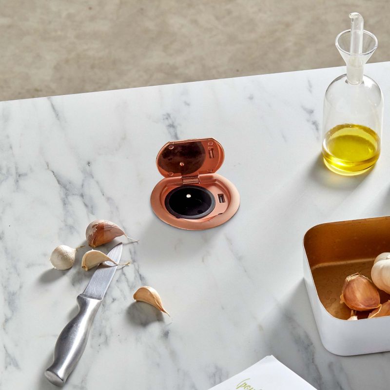 Bloc 1 prise + 1 USB RING à clapet affleurant à encastrer dans un plan de travail, Cuivre mat