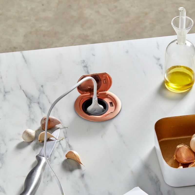 Le bloc prise à encastrer RING à clapet affleurant de MSA France est doté d’une prise électrique 16A et d’un port USB-A. Il se distingue immédiatement par sa finition cuivre mat, une teinte rare et précieuse qui capte la lumière et attire le regard. Parfaitement intégré dans un plan de travail, ce dispositif combine élégance et discrétion grâce à son clapet affleurant, tout en apportant une touche chaleureuse et résolument tendance à votre cuisine.