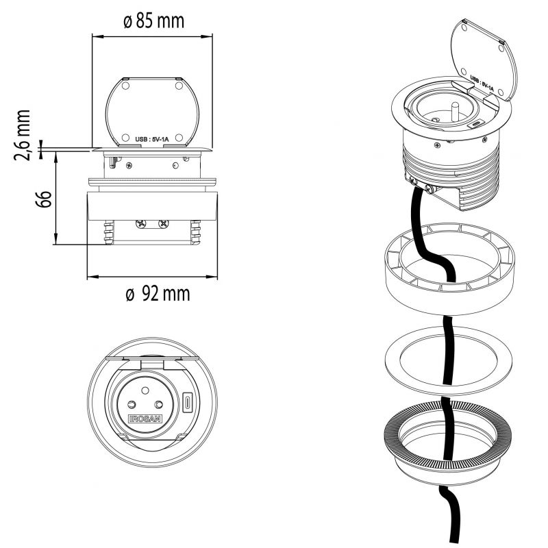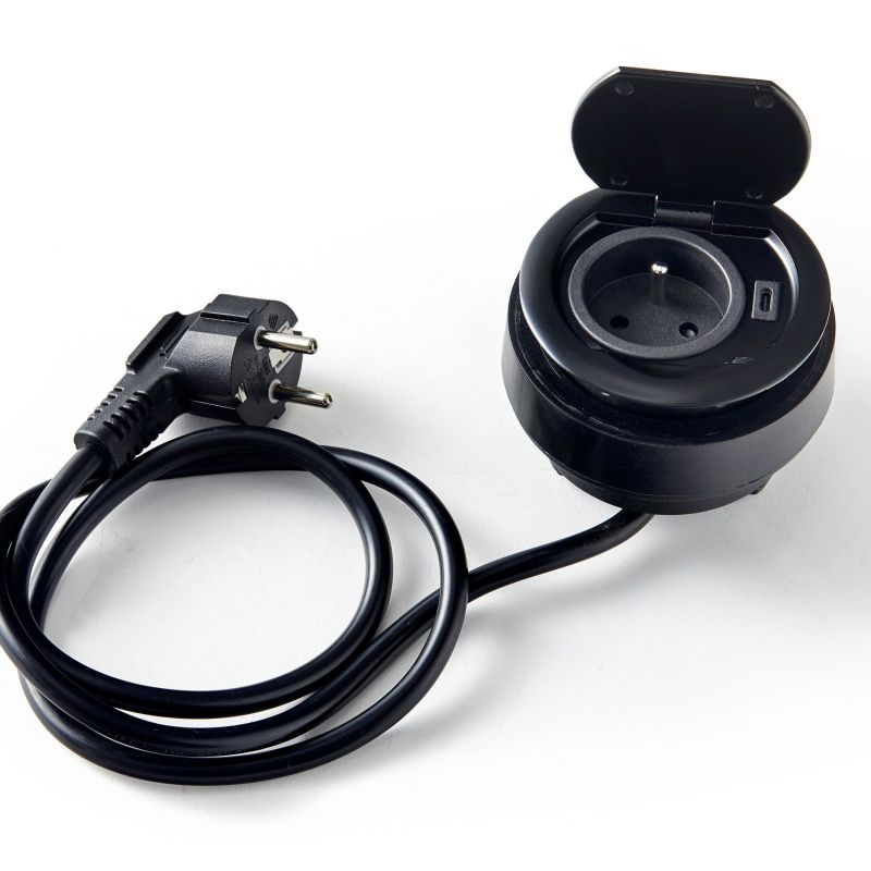 Facile et rapide à installer, ce bloc prise encastrable se fixe sur votre plan de travail après avoir réalisé au préalable un perçage de 70mm de diamètre. Il s’adapte à des plans de travail d’une épaisseur allant de 5 à 45 mm. Il est équipé d’un câble d'alimentation de 1 mètre (3 x 1,5 mm²) avec fiche euro, prêt à l’installation. Son clapet en métal protège efficacement les prises de la poussière et de l’humidité, tout en assurant une ouverture simple et fluide grâce à son système d'assistance à l'ouverture et à la fermeture. Design, fonctionnel et robuste, ce bloc prise finition chrome noir est un choix stratégique pour optimiser votre espace avec style.