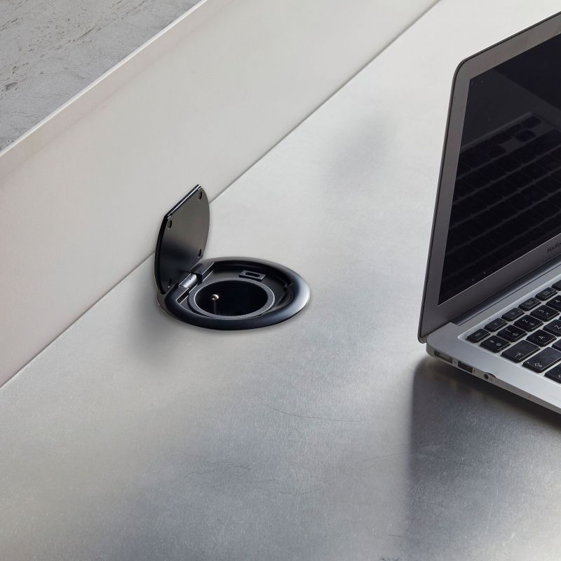 Le bloc prise RING à clapet affleurant de MSA France finition noir mat (RAL9005) dispose d'une prise et d'un port USB-C. Il est une solution d'alimentation élégante et fonctionnelle conçue pour s'intégrer harmonieusement dans le plan de travail de votre cuisine, sur votre bureau tout autre espace de travail, même les ateliers. Doté d'un clapet métallique affleurant, ce bloc se fond discrètement dans son environnement, offrant une prise de courant 16A et un port USB-C pour répondre aux normes de charge actuels. Son système d'ouverture assistée assure une utilisation fluide et sécurisée.