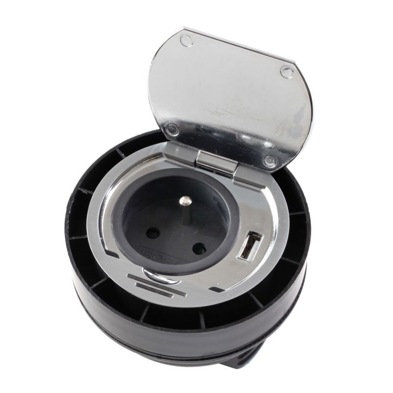 Bloc prise + USB (1A - 5V) affleurant DISC avec clapet à encastrer dans un plan de travail de 5 à 45mm - finition noir mat (RAL 9005) - 16A - 230V - 2P+T