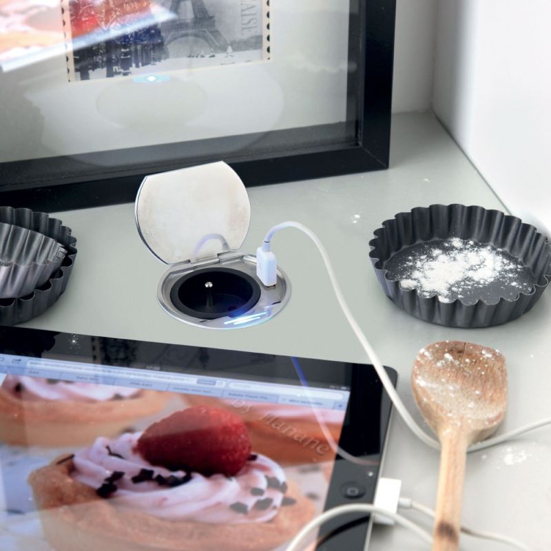 Bloc 1 prise + 1 USB DISC avec clapet affleurant à encastrer dans un plan de travail, Inox brossé