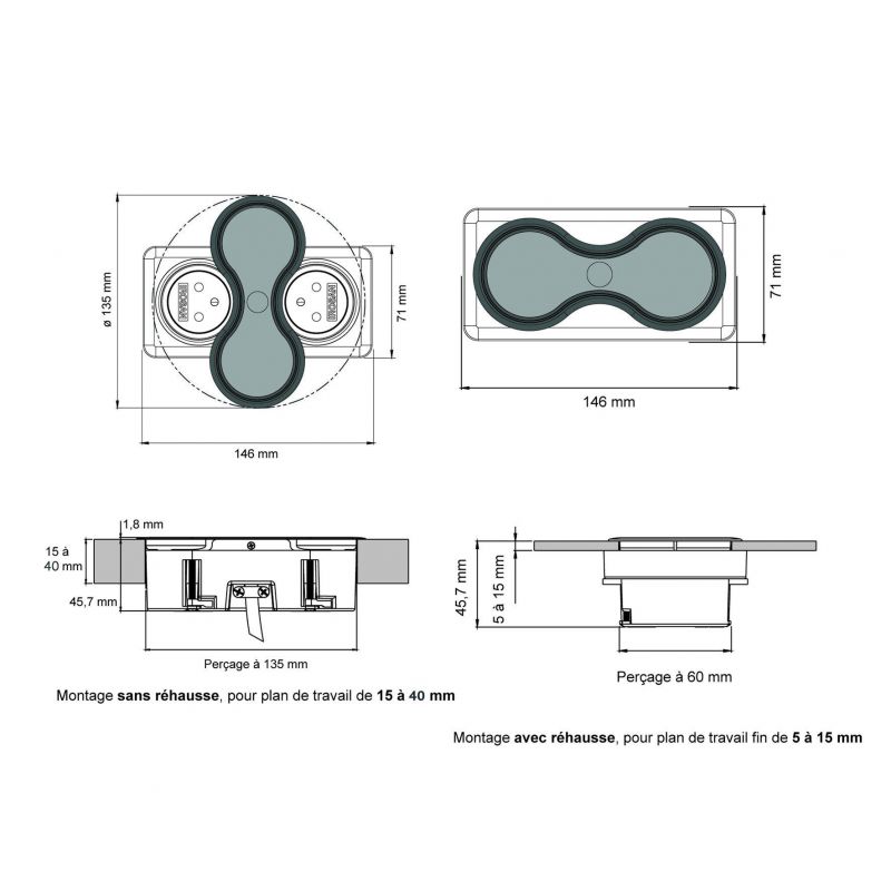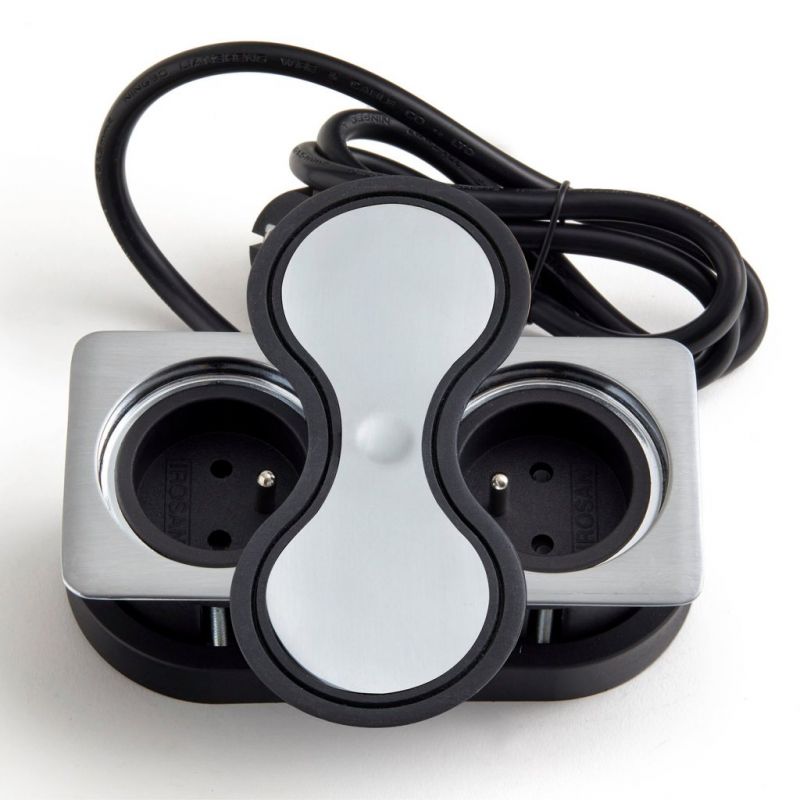 Bloc 2 prises EIGHT IP44 rectangulaire affleurant à encastrer dans un plan de travail de 5 à 40mm - finition noir mat - 16A - 230V - 2P+T