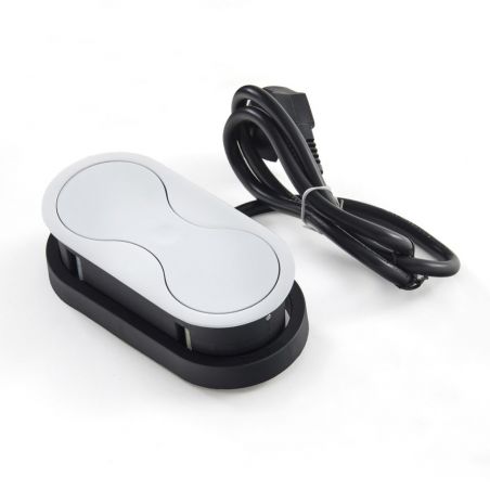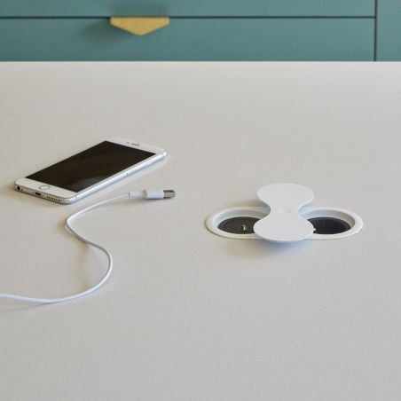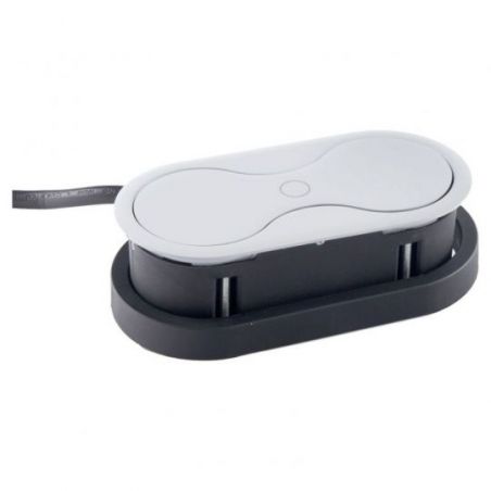Il dispose d'une prise 16A ainsi que d’un port USB-A 5V (1A), permettant de recharger facilement téléphone ou accessoires sans chargeur secteur. L’installation est simple sur un plan de travail allant de 5 à 40 mm grâce à la réhausse fournie. Son système d’ouverture par pression centrale garantit un usage fluide et discret.
