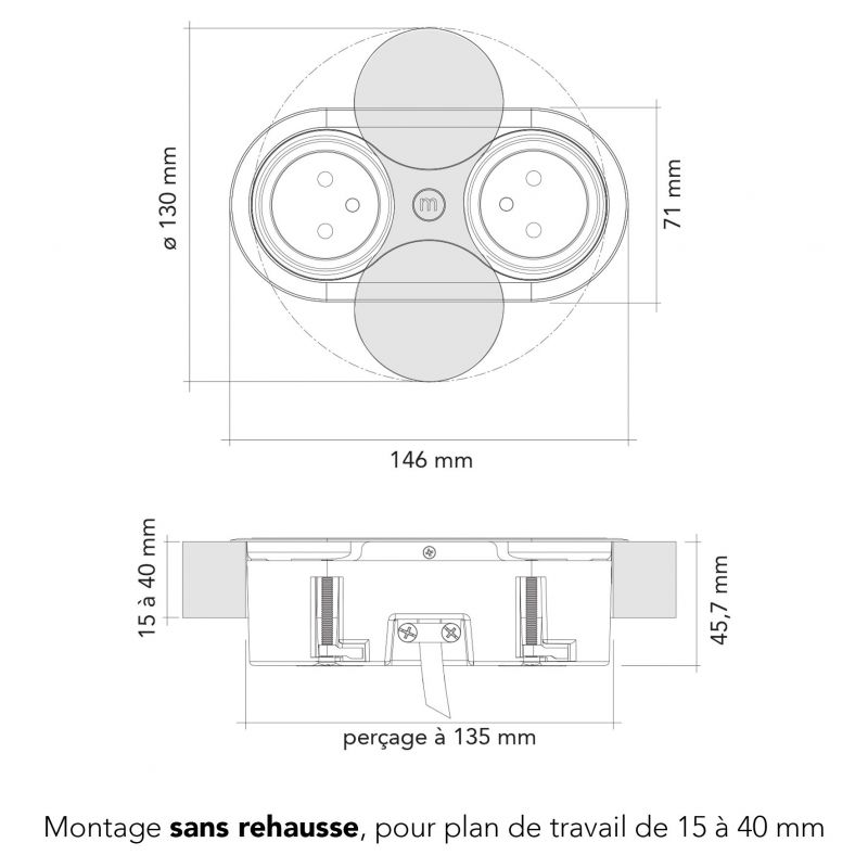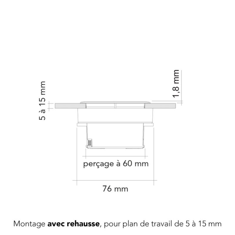 Il s'installe facilement sur des plans de travail allant de 5 à 40 mm grâce à la réhausse fournie. Équipé d'une prise 16A et d’un port USB-A 5V (1A), il permet de charger smartphone ou accessoires sans adaptateur. L'ouverture du clapet se fait par simple pression ce qui rend l’usage simple, rapide et agréable au quotidien.