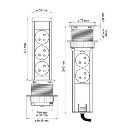 Bloc 3 prises + 2 USB MINIBRICK rétractable- Noir- Diam.60mm