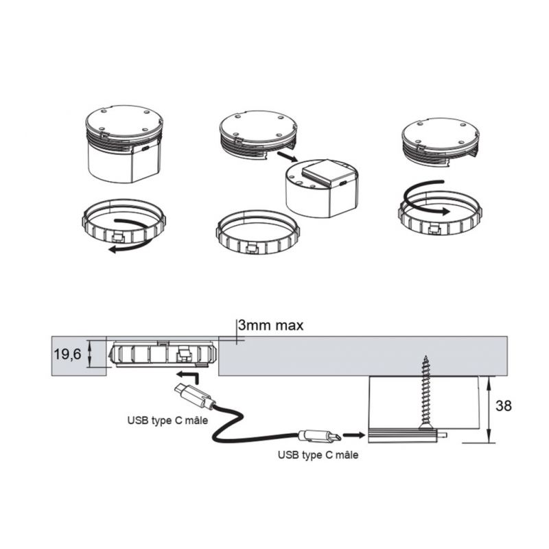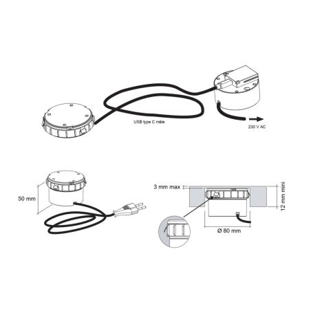 Pensé pour un usage intuitif, ce chargeur à induction encastrable se fixe facilement grâce à son diamètre de perçage de 80 mm et sa profondeur d’encastrement optimisée. Le pack complet inclut le bloc chargeur, le convertisseur et un câble d’alimentation de 2,5 m, et il est possible de dissocier le convertisseur pour réduire la profondeur selon l’épaisseur du plan. Ce système permet une recharge rapide et sans fil jusqu’à 15W, offrant un confort maximal au quotidien, sans câble visible et directement sur votre plan de travail.