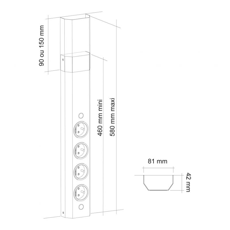 Bloc 4 prises frontal (460 x 80 x 42) livré avec 2 pièces de réglage (H. 90 et 150mm) permettant d'ajuster la hauteur - finition inox brossé - 16A - 230V - 2P+T