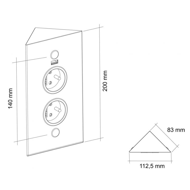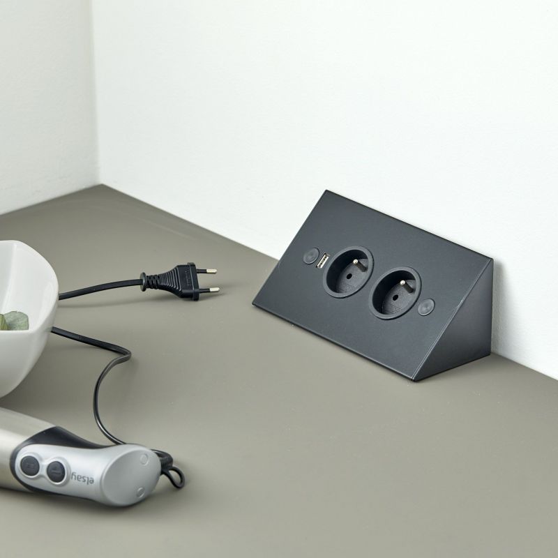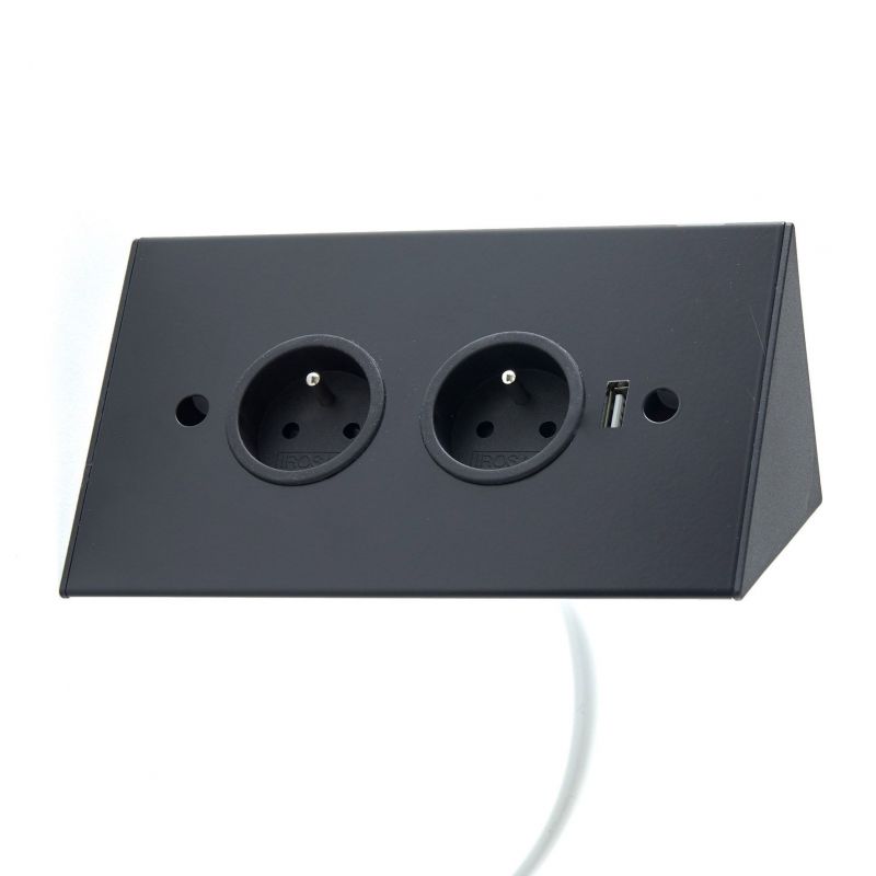 Bloc 2 prises d'angle + 1 USB (200 x 112,5 x 83) - A fixer sur un plan de travail ou dans un meuble, Noir mat