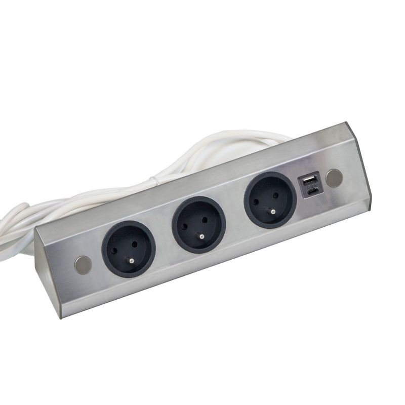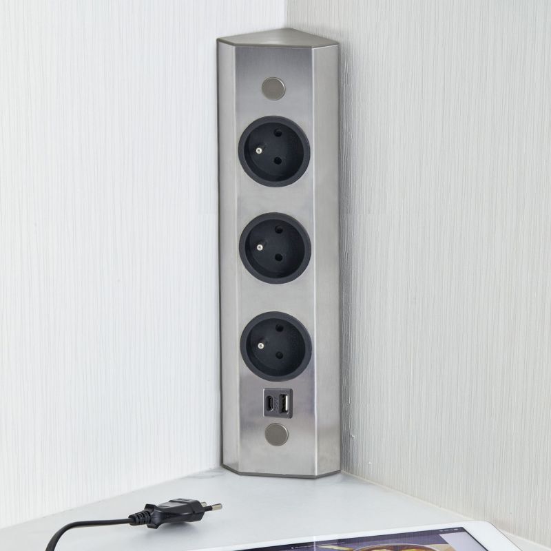Bloc 3 prises d'angle + 1 USB-A + 1 USB-C spécialement étudié pour un montage avec retour de plan de travail, Inox brossé
