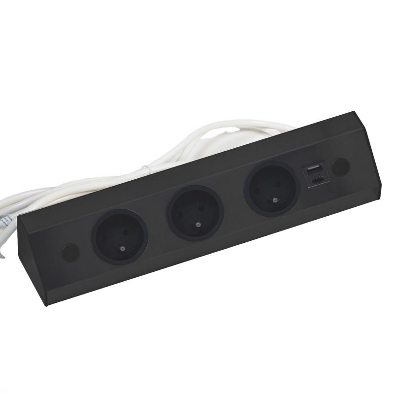 Bloc 3 prises d'angle + USB spécialement étudié pour un montage avec retour de plan de travail - finition noir - 16A - 230V - 2P+T