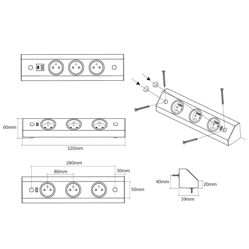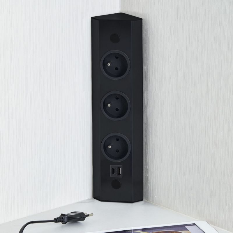 Bloc 3 prises d'angle + 1 USB-A + 1 USB-C spécialement étudié pour un montage avec retour de plan de travail, Noir mat