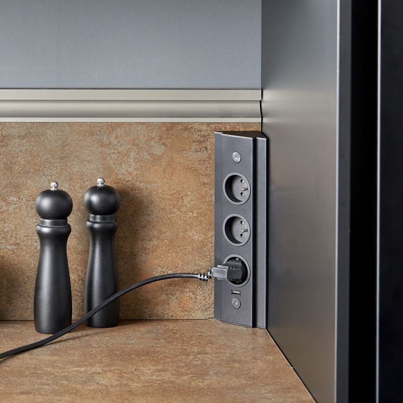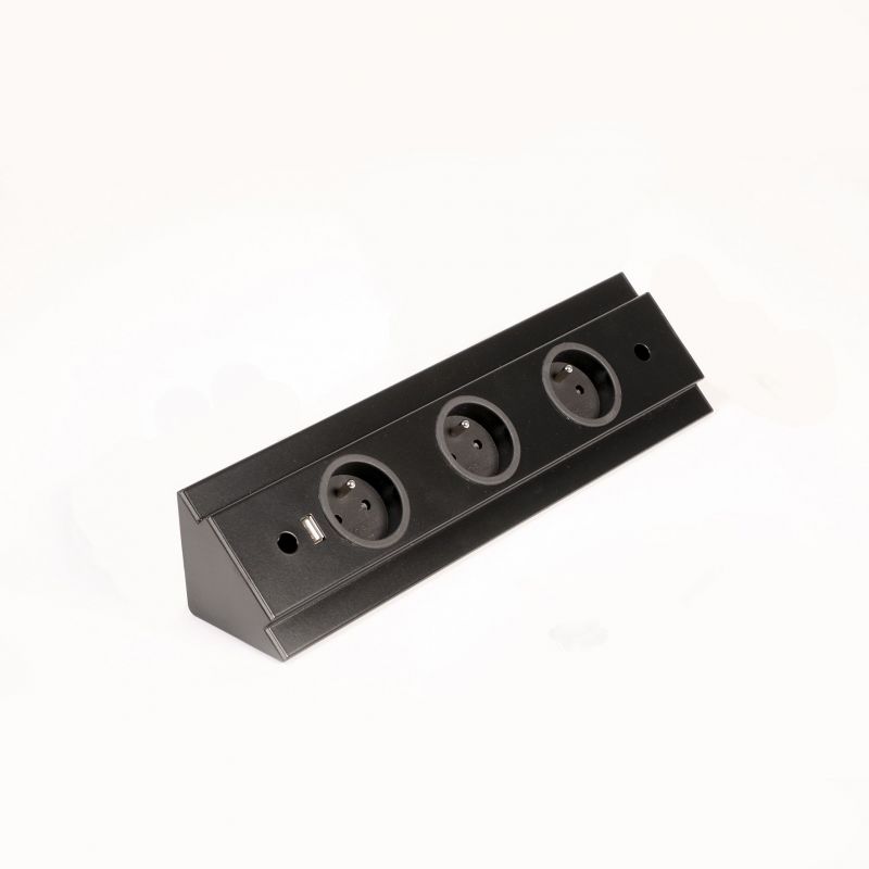 Bloc 3 prises d'angle + 1 port USB, spécialement étudié pour un montage avec retour de plan de travail - finition noir