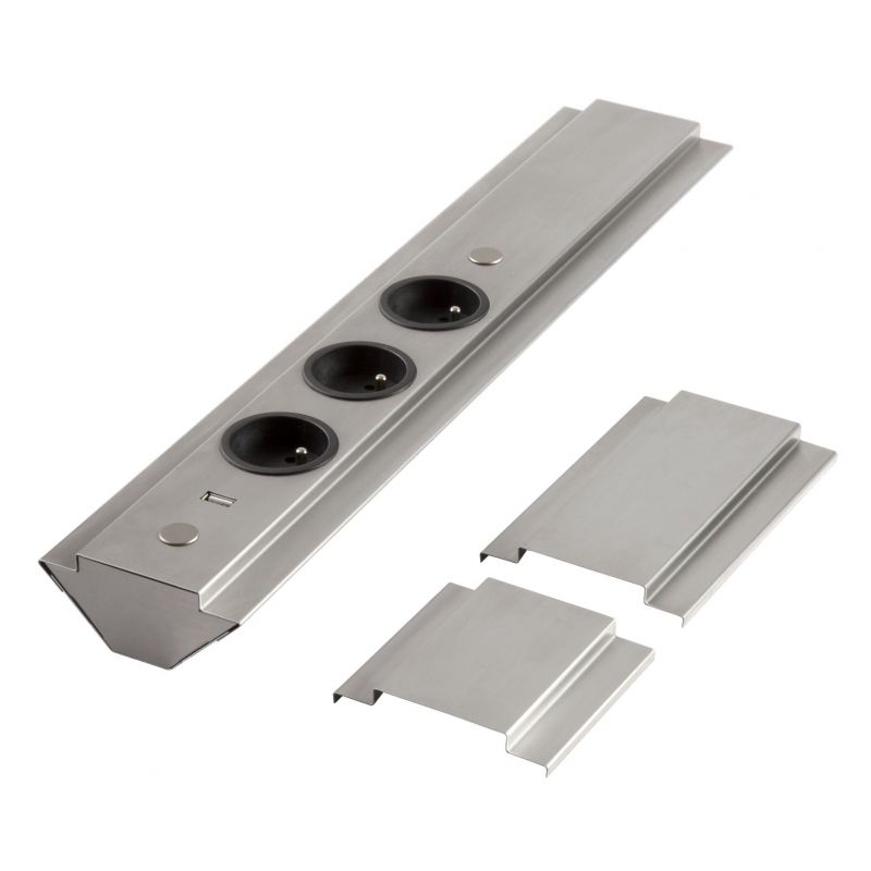 Bloc 3 prises d'angle + 1 port USB (460 x 90 x 54,5) livré avec 2 pièces de réglage pour ajuster la hauteur, Inox brossé