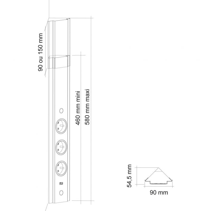 Bloc 3 prises + 1 port USB A+C d'angle (460 x 92 x 60) livré avec 2 pièces de réglage (H. 90 et 150mm) permettant d'ajuster la hauteur - finition noir mat - 16A - 230V - 2P+T