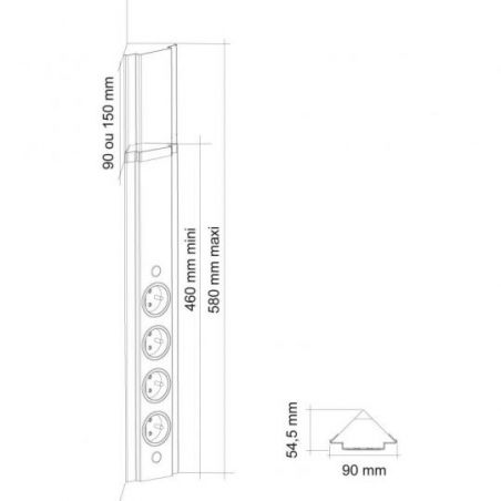 Bloc 3 prises + 1 port USB (0,8A - 5V) d'angle (460 x 90 x 54,5) livré avec 2 pièces de réglage (H. 90 et 150mm) permettant d'ajuster la hauteur - finition inox brossé - 16A - 230V - 2P+T