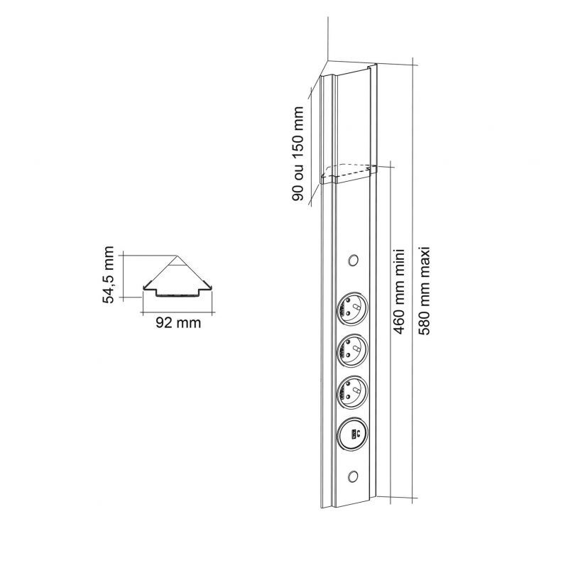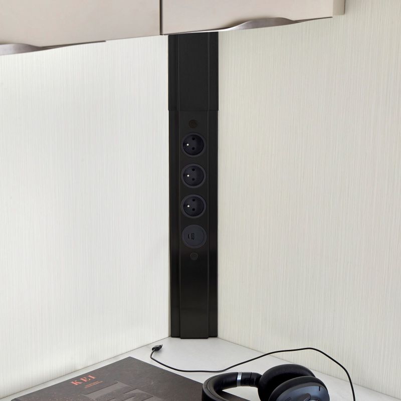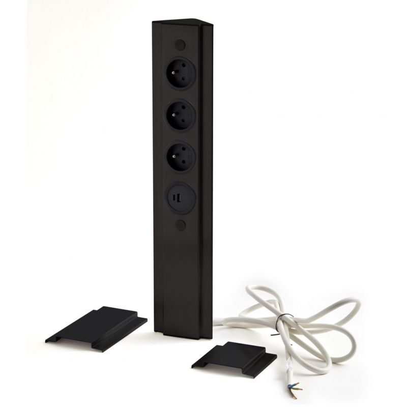 Bloc 3 prises + 1 port USB A+C d'angle (460 x 92 x 60) livré avec 2 pièces de réglage (H. 90 et 150mm) permettant d'ajuster la hauteur - finition noir mat - 16A - 230V - 2P+T