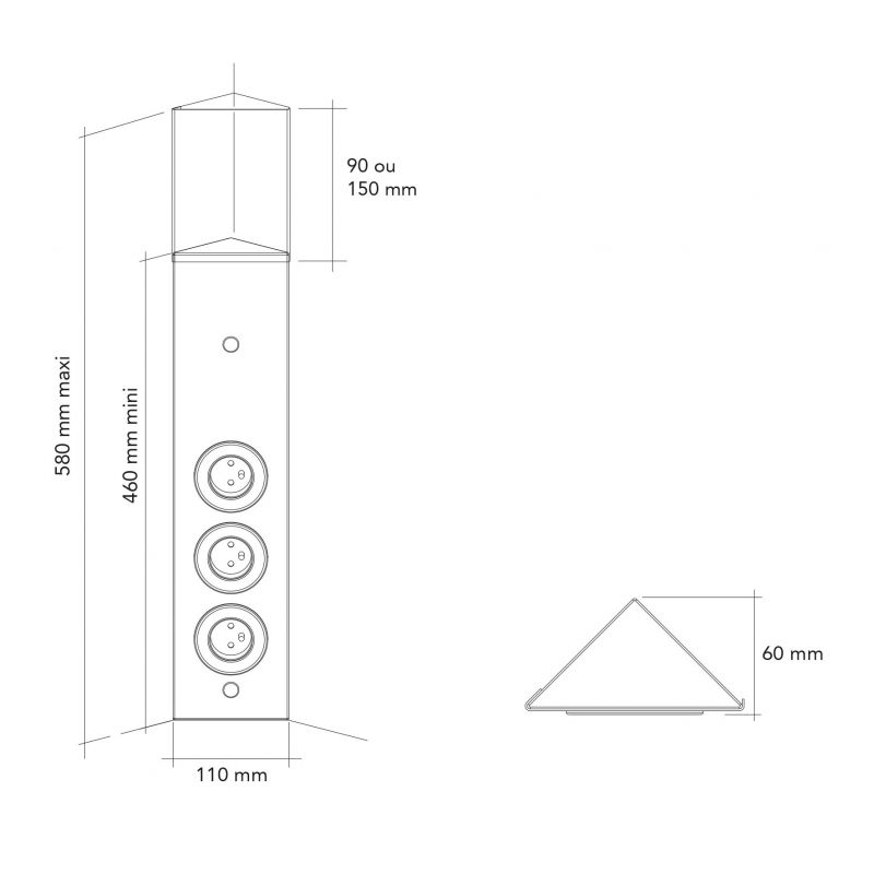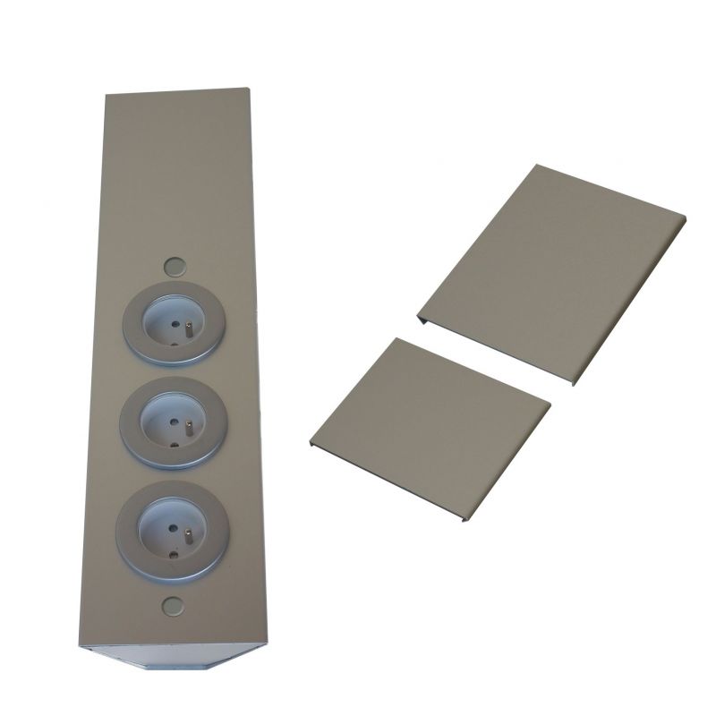 Bloc 3 prises d'angle (460 x 110 x 60) livré avec 2 pièces de réglage (H. 90 et 150mm) permettant d'ajuster la hauteur - finition inox brossé - façade métal - 16 A - 230V - 2P+T