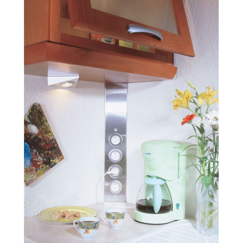 Bloc 4 prises d'angle (460 x 110 x 60) livré avec 2 pièces de réglage (H. 90 et 150mm) permettant d'ajuster la hauteur - finition inox brossé - façade métal - 16 A - 230V - 2P+T