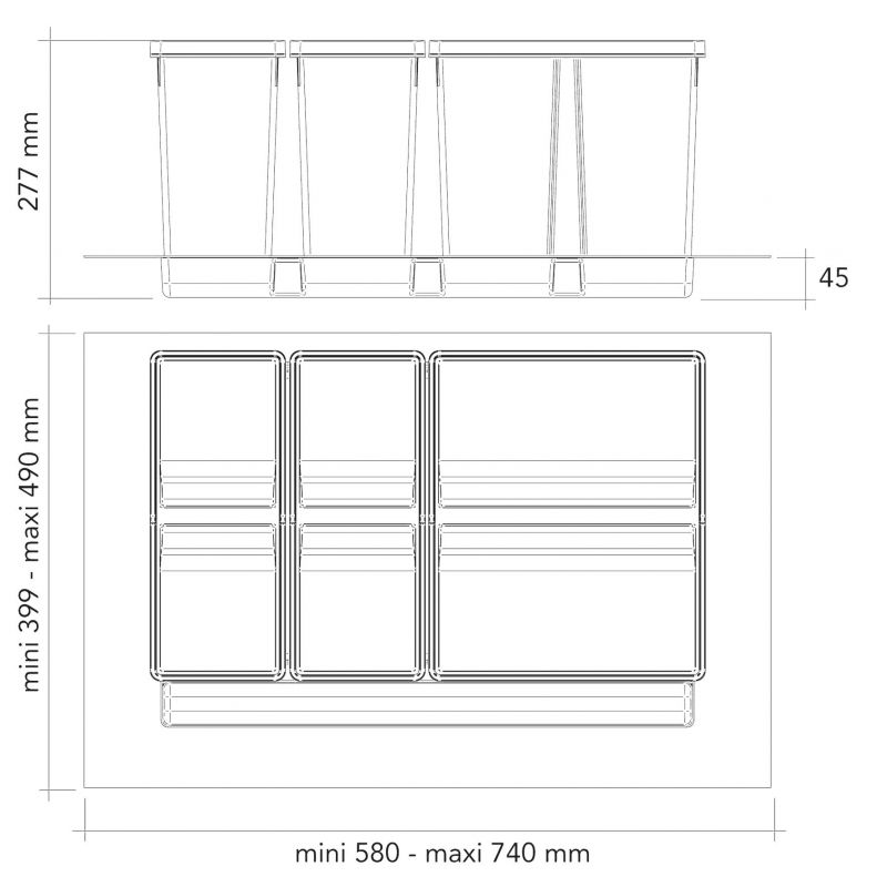 Collecteur composé de 3 seaux avec couvercles : 1 x 26L + 2 x 11L et d'1 séparateur de bac - pour tiroir de 800mm - H. 277mm