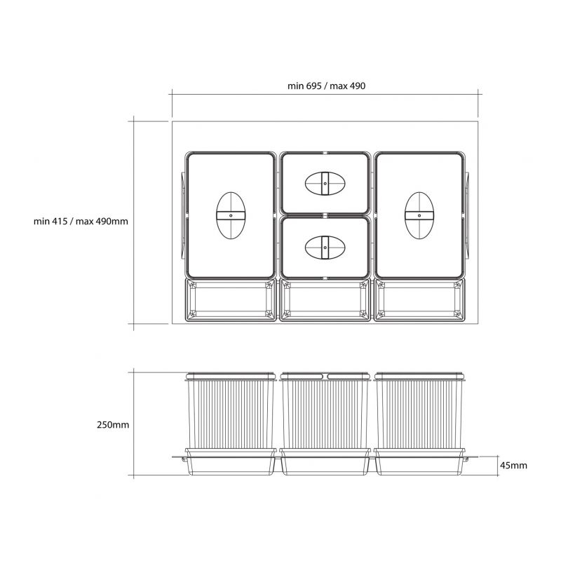 Collecteur composé de 4 seaux avec couvercles : 2 x 14L + 2 x 6,5L et de 3 bacs amovibles - pour tiroir de 800mm - H. 250mm-finition Gris