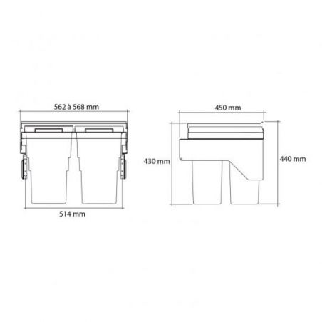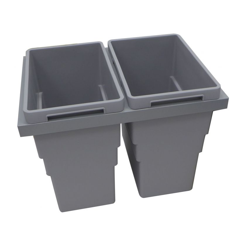 Poubelle pour meuble de 600mm composée de 2 bacs : 2 x 30L et d'1 couvercle fixe - l. 562 à 568 x P. 450 x H. 440mm - ouverture manuelle avec système SOFT-Gris