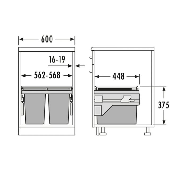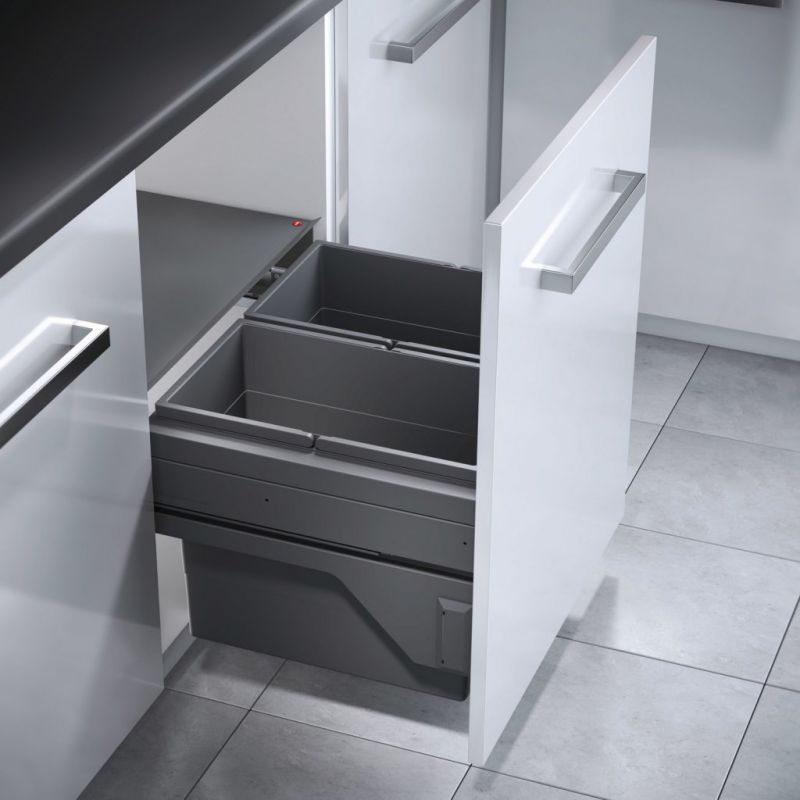 Poubelle pour meuble de 600mm composée de 2 bacs : 2 x 28L et d'1 couvercle fixe - l. 562 à 568 x P. 448 x H. 375mm - ouverture manuelle avec système SOFT-Gris orion
