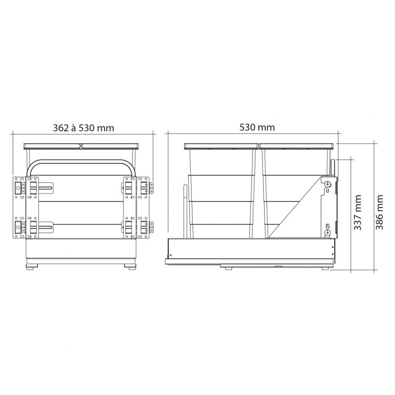 Poubelle pour meuble de 400 à 600mm composée de 2 seaux avec couvercles : 2 x 24L- l. 350 à 530 x P. 530 x H. 386mm - ouverture manuelle avec système SOFT